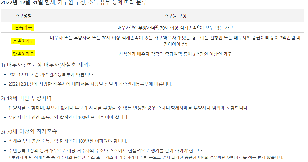 - 단독가구 : 배우자와 부양자녀, 70세 이상 직계존속(부모님 등)