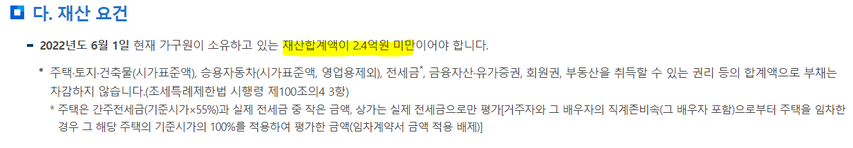 2022년도 6월 1일을 기준으로 하여 가구원 전원이 소유하고 있는 재산의 총합계가 2.4억 원 미만이어야 합니다