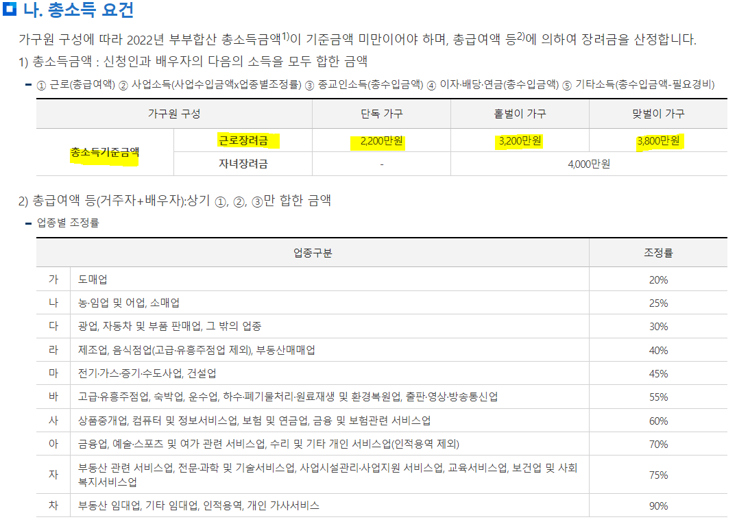 2022년도 나와 배우자의 급여를 합쳐서 총금액이 가구유형별로 정해진 금액 미만 이어야 하고, 급여 총액에 따라 지급여부가 결정됩니다.