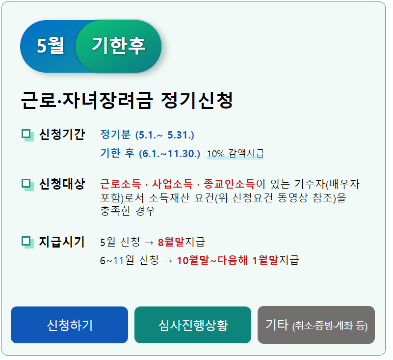 근로장려금 신청은 정기분 신청기간과 반기분 신청기간이 있습니다. 신청 기간을 놓치지 않게 신청해 보세요!