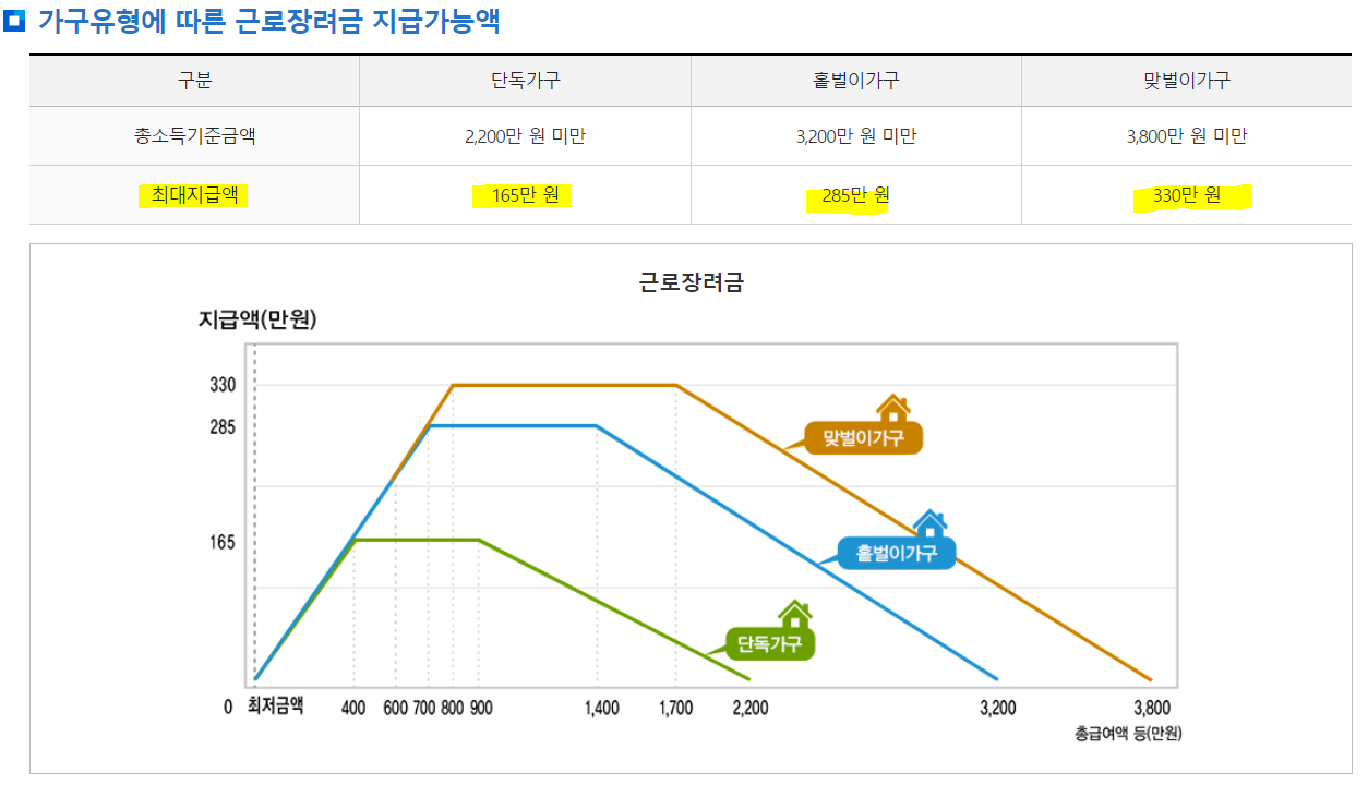 우리 가정은 얼마까지 지원받을 수 있는지 국세청 사이트에서 제공하는 장려금 금액 계산기를 통해 확인할 수 있습니다