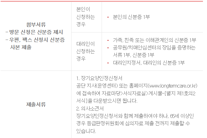 · 대리인 신청 : 가족 등 대리인의 신분증, 의사소견서, 신청서 작성해서 국민건강공단에 방문하여 서류를 제출합니다.