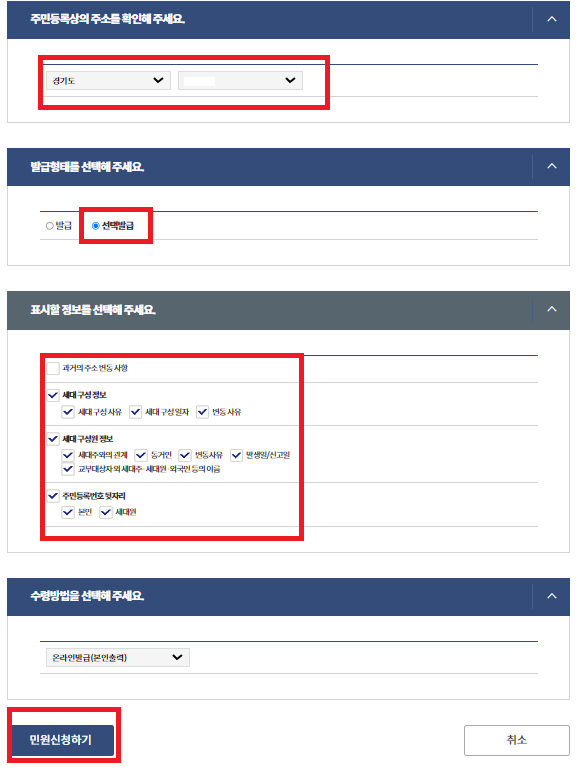 - 선택발급 (일반적으로 주민센터에서 발급해주는 등본)을 체크한 후 아래 사진과 같이 체크해 주세요