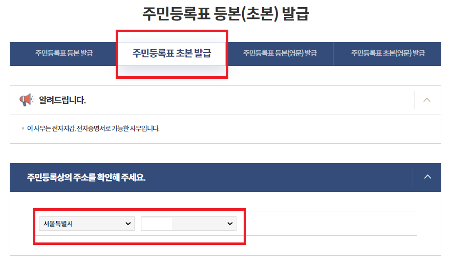 - 주민등록 초본 발급을 클릭한 후 전입신고해 둔 주소지의 시군구를 입력합니다