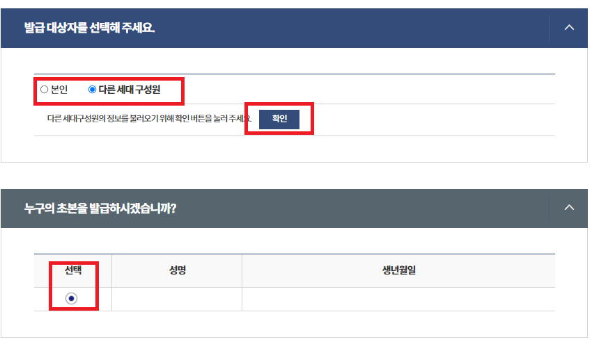 - 발급대상자를 선택해 주세요 (본인과 같이 전입신고가 되어있는 가족들(다른 세대구성원)의 초본 출력이 가능)