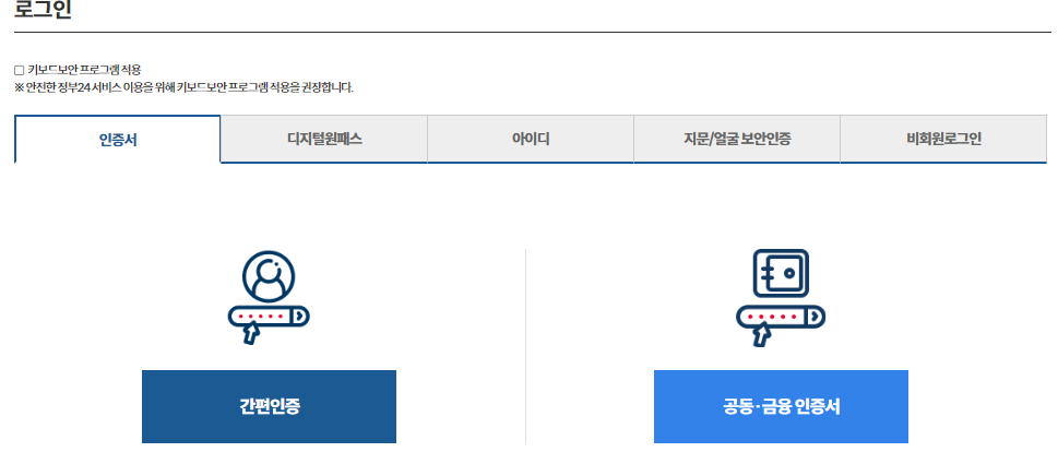 처음 로그인 하실 때 인증서 로그인을 안 하셨으면 간편 인증 또는 인증서로 로그인을 해주세요