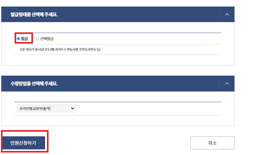 - 발급과 선택발급 중에 보통 주민센터에서 뽑는 초본과 똑같은 것을 원하시면 발급으로 선택 후 민원신청하기 눌러줍니다