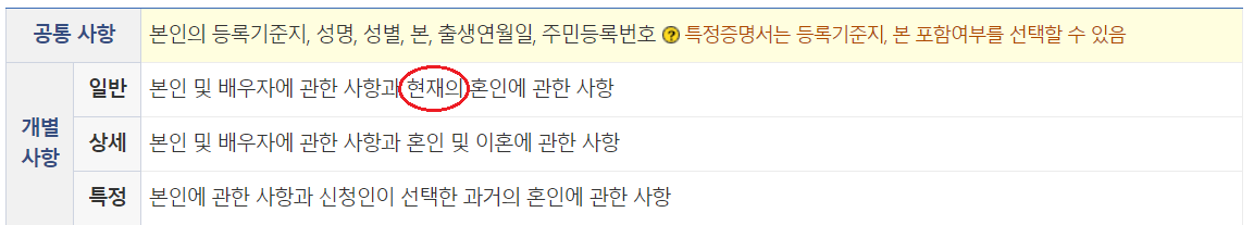 일반증명서는 지금 현재의 시점의 혼인상태(미혼, 기혼)를 알려주고 상세증명서의 경우 과거의 이력까지 모두 나옵니다.