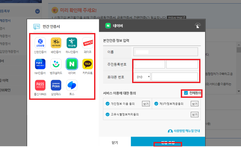 이용약관 동의에 체크하여 준 후 신청인 정보(본인) 이름, 주민번호, 추가 정보를 입력합니다. 선택 할 수 있는 인증서 세 가지 중 한 가지를 선택합니다. 인증서가 있는 경우는 인증서를 사용하고 인증서가 없는 경우 간편 인증을 하면 빠르게 인증이 가능합니다.